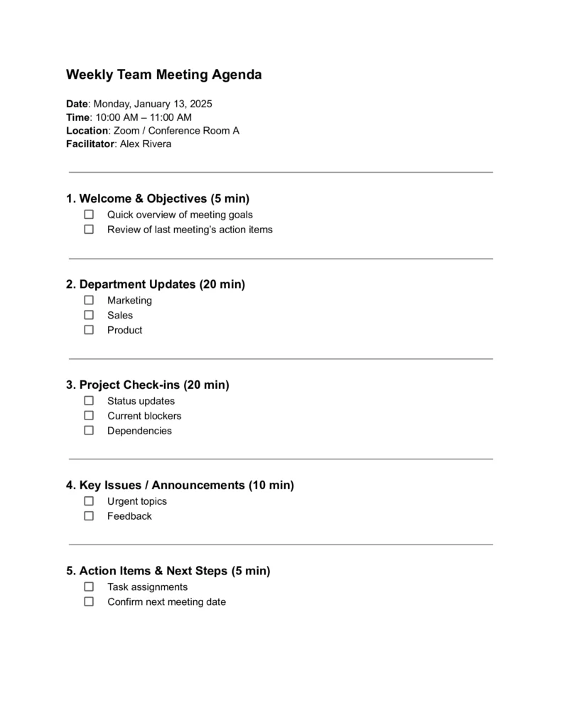 Organize meetings, events, or daily tasks with simple agenda templates. A helpful tool for professionals, students, and teams.
