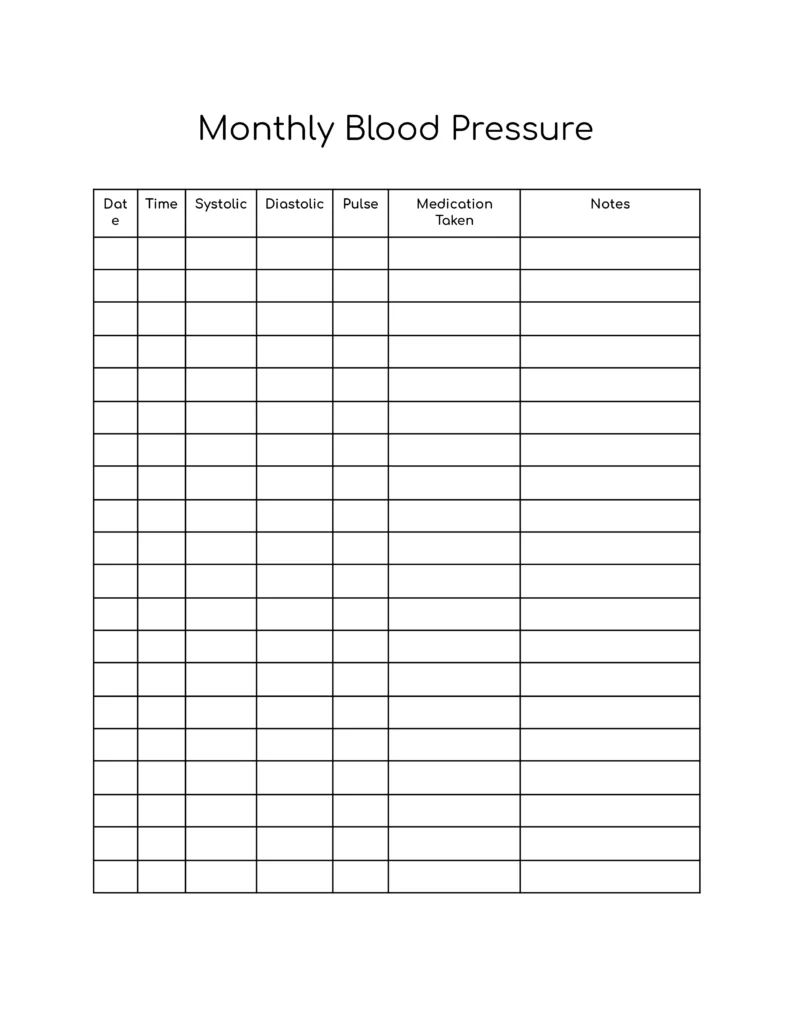 Record your systolic and diastolic readings along with the date and time. Some templates also include space for heart rate and notes.