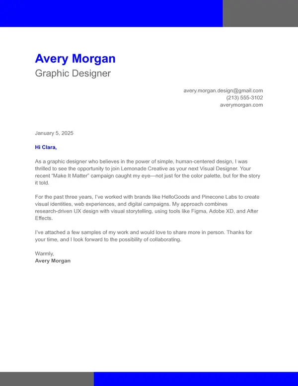 Pair your resume with a matching cover letter. Our templates help you craft a compelling introduction tailored to any job opportunity.